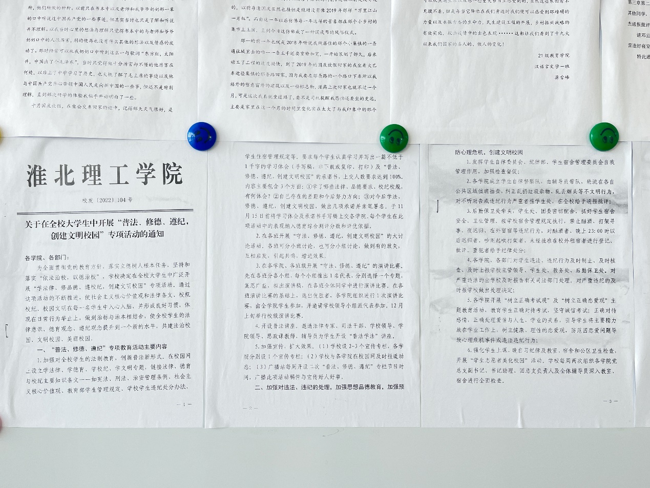 为加大宣传力度,给予同学们更深刻的教育。我院利用好宣传阵地,以喜闻乐见的方式向师生普及法律知识,传递法治精神。共同提升了师生普法、修德、遵纪的自觉意识,掀起了遵法、学法、守法用法的热潮。