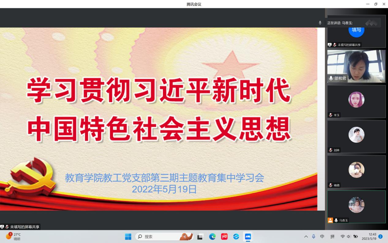 5月19日下午,必赢76net线路官网学习贯彻习近平新时代中国特色社会主义思想主题教育开展第三期读书班党课学习,本次学习会以“线上课堂”形式举行,由教工党支部委员邵和君同志主持并领学。