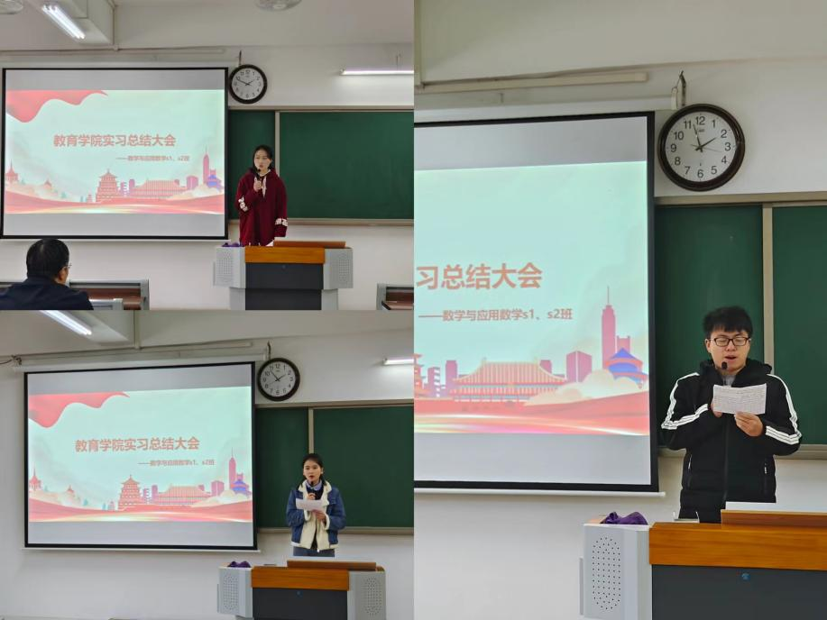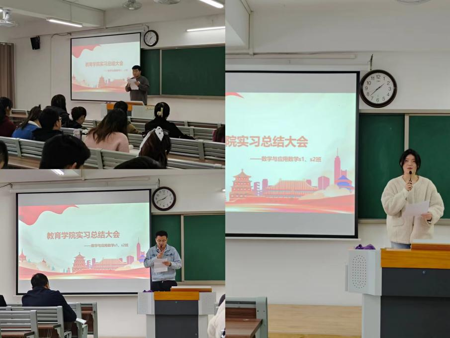 本次总结大会由数学与应用数学教研室李姜悦老师主持,大会主要就2021级数学与应用数学专业在淮北市五所实习学校集中实习及分散实习工作进行总结汇报。两个班各派出三位学生代表,对历时12周的教育实习进行有感发言。六位同学都真情实感地汇报了自己在实习学校的实习经历和心得体会。同学们表示,经过此次教育实习和锻炼,自己在知识积累和实践能力方面都有了很大的进步,同时也深刻地认识到,当代大学生不仅要加强自身专业知识和技能的学习,还要不断提高自身的综合素质与能力。