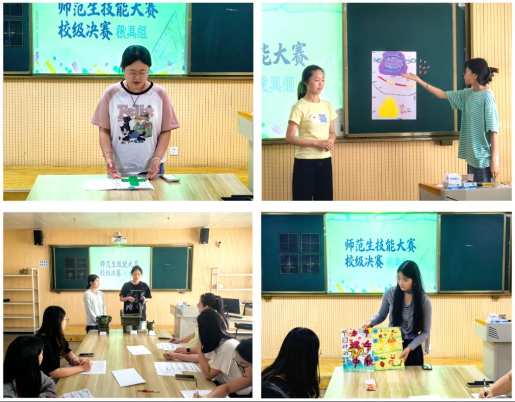 近日,必赢76net线路官网2025年师范生技能大赛教具组校级决赛在艺术楼303教室顺利举办。作为院赛优秀成果的进阶比拼舞台,本次校赛汇聚了来自各专业经过院赛层层筛选的6支优秀师范生团队,各队伍带着精心打磨的教具作品与操作演示,在赛场上展开了一场精彩绝伦的“教学匠心对决”。相较于院赛阶段的探索与实践,进入校赛的各团队更显从容与专业。比赛中,选手们围绕“教具实用性”“教学设计创新性”“学科知识准确性”三大核心维度,通过教具设计目标、现场演示等环节,全面展现教具在破解教学重难点中的独特价值。
