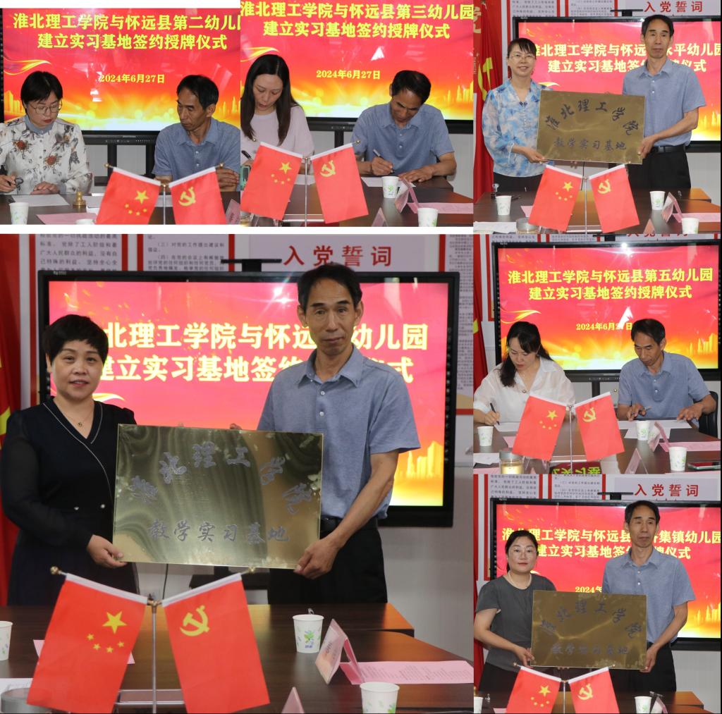 在实践基地的六所幼儿园园长分别对各自园所进行了详细介绍后,怀远县县幼园长刘利代表宣读实践基地签约协议书,双方就协议书的内容进行了充分的交流和沟通。而后在友好而庄重的气氛中,必赢76net线路官网必赢76net线路官网副院长谢贤德与六所园所园长分别签订协议书,并举行了授牌仪式,这标志着双方合作迈出了坚实的一步。