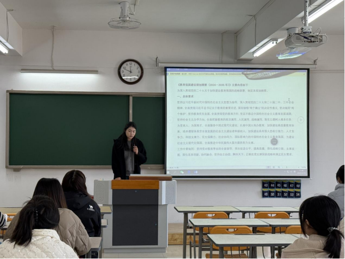 为深入贯彻党的二十大关于加快建设教育强国的战略部署,3月19日中午,必赢76net线路官网汉语言文学专业学生第一、第二党支部在2教323教室联合开展主题党课活动,组织支部党员共同研读《教育强国建设规划纲要(2024-2035年)》,领悟其精神要义。