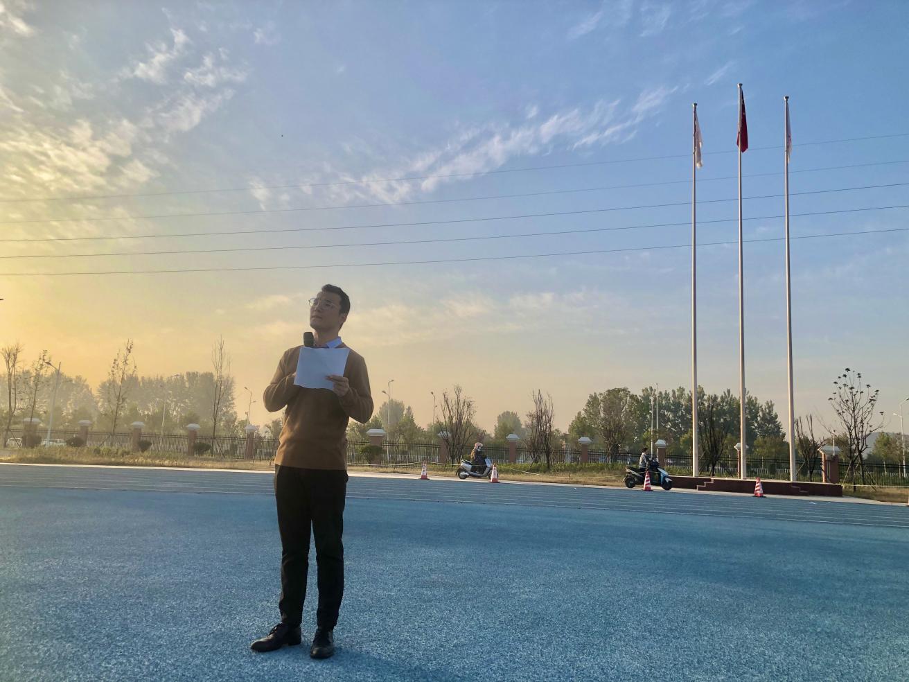 辅导员许海涛作为教师代表发言,许老师表示爱国不是口号,而是行动。同学们应该把爱国主义精神转化为爱学校、爱集体、爱学习的热情。大学生作为祖国未来的主人,有责任、有义务、用实际行动挑起振兴中华民族的重担。