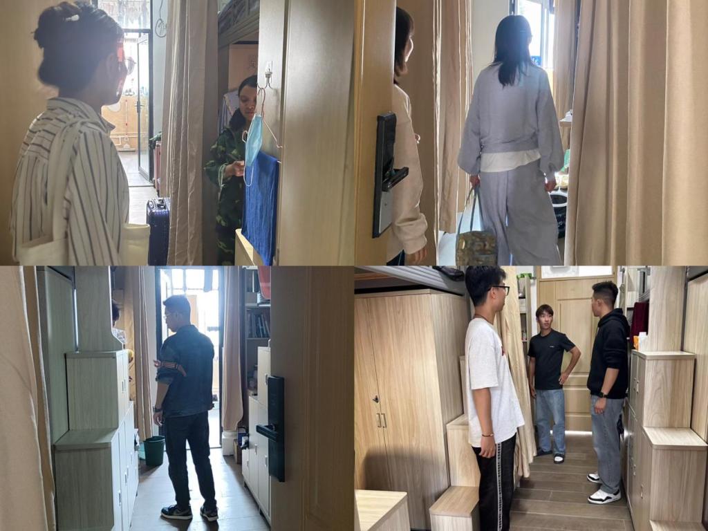学院每周三中午组织辅导员老师深入宿舍查看学生寝室卫生状况,了解学生生活环境和思想动态,面对面开展谈心谈话活动,指导学生做好寝室通风、安全用电、环境消杀等方面工作。要求同学们自觉遵守宿舍管理规章制度,遇到矛盾多沟通,共同营造安全和谐的宿舍环境。并对环境卫生较好、气氛融洽的宿舍进行表扬,对存在问题的宿舍提出整改建议。