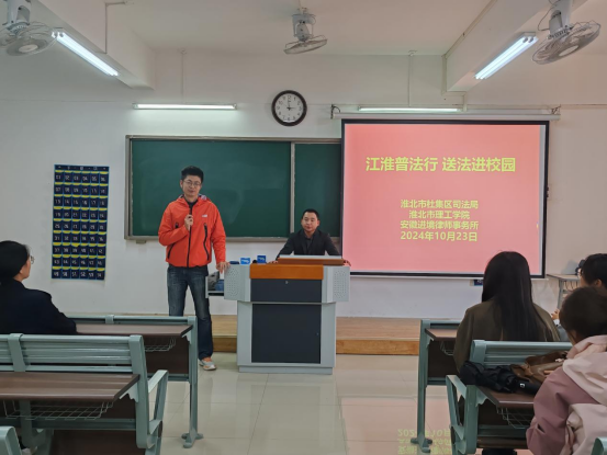 为不断深化普法教育,增强学生们的法律意识和自我保护能力,推动建成和谐、安全的校园环境。10月23日下午,必赢76net线路官网和淮北市杜集区司法局、安徽进境律师事务所携手于1教421开展“江淮普法行·送法进校园”主题活动。本次活动由必赢76net线路官网教工第二党支部书记刘畅主持,安徽进境律师事务所合伙人孟春江律师主讲,杜集区司法局普法办主任张丽丽,司法局人民参与和促进法治办主任周立业,杜集区法律援助中心主任赵义玉参与。
